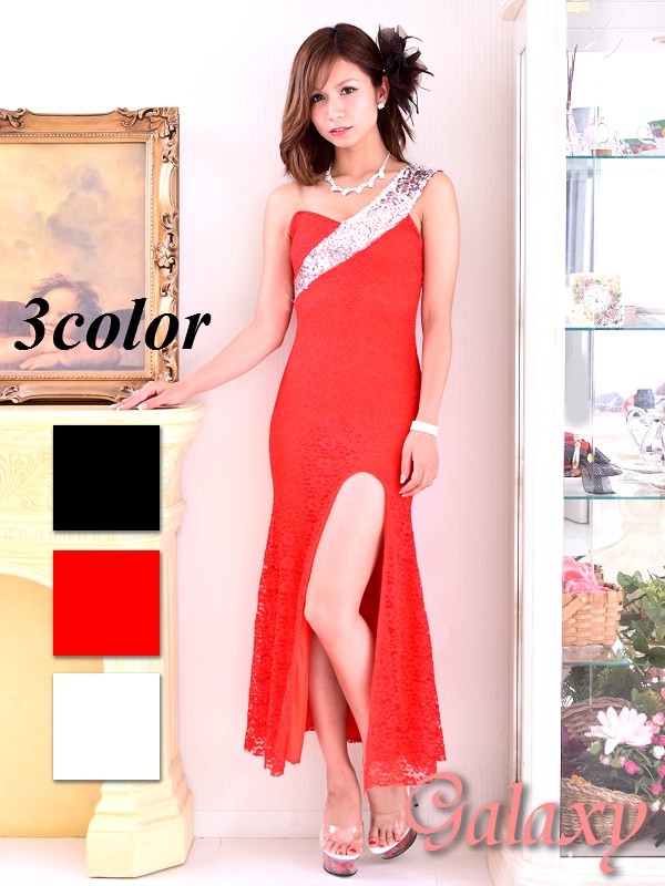 肩紐スパンコール装飾ワンショルダーデザインレースロングドレス