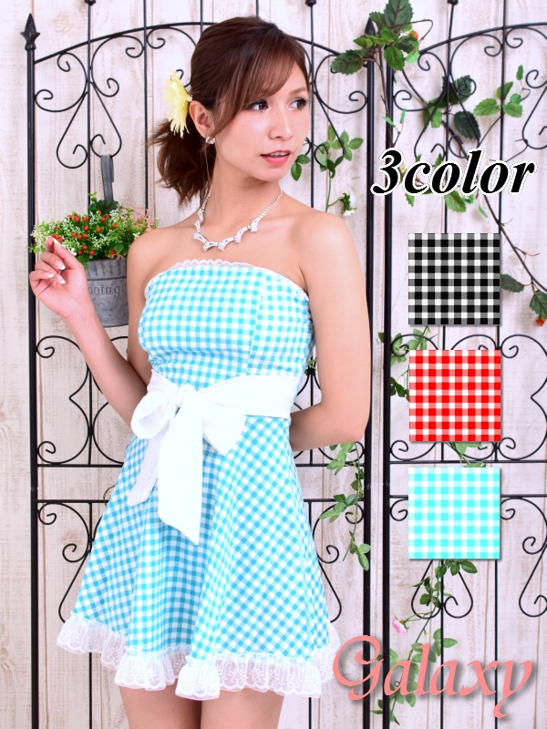 キュートなサテンリボン&裾レースデザイン*チェック柄フレアーミニワンピ