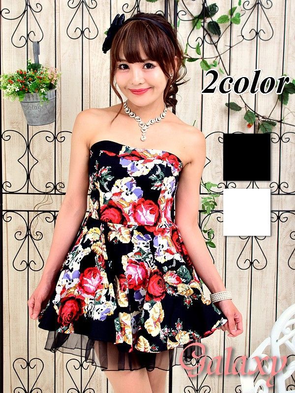 薔薇刺繍風プリント裾チュール見せミニワンピース