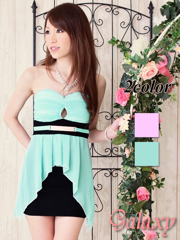 Lサイズ★ベアトップ胸元レースデザインぺプラムミニドレス