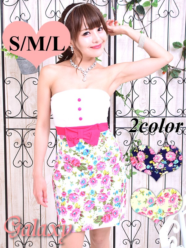 リボン付花柄スリムラインミニワンピース*S/M/L
