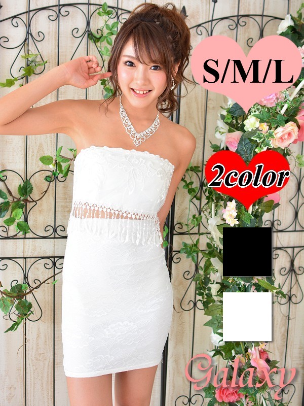 ウエストシースルー*胸元刺繍入り*フリンジ付きベアトップレースミニワンピ