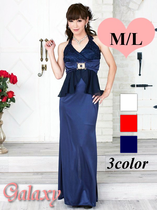 ベルト風GOLDバックル付*ケミカルレース重ねシフォンぺプラムストレッチサテンロングドレス