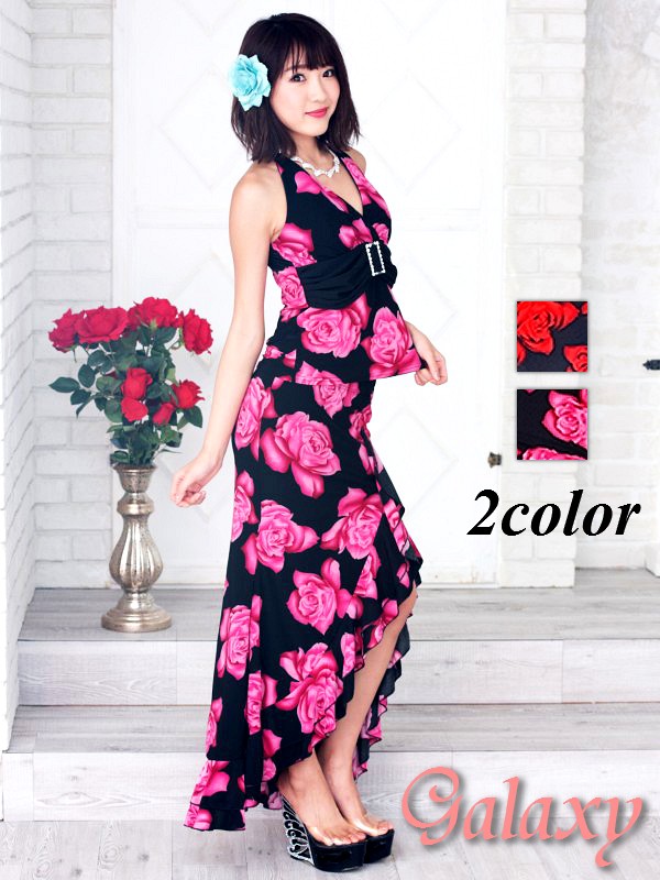 Lサイズ★スリット入りフロントフリル*ジルコニアスクエアーバックル付きシャドウローズ柄2ピースドレス*2color