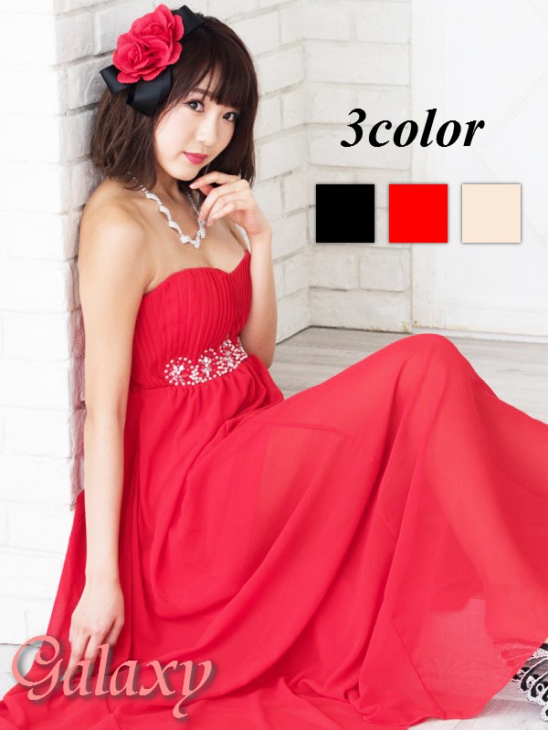 パールビーズ&ビジュ装飾*背中ギャザーシフォン重ねロングドレス*3color