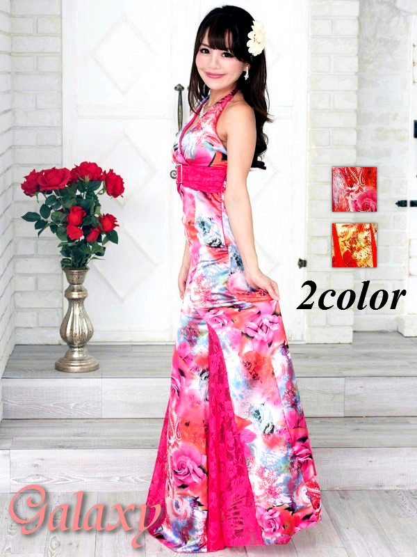 ローズ&ペイズリーグラデーション*レーススリット切替サテンロングドレス*2color