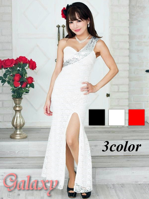 肩紐スパンコール装飾ワンショルダーデザインレースロングドレス