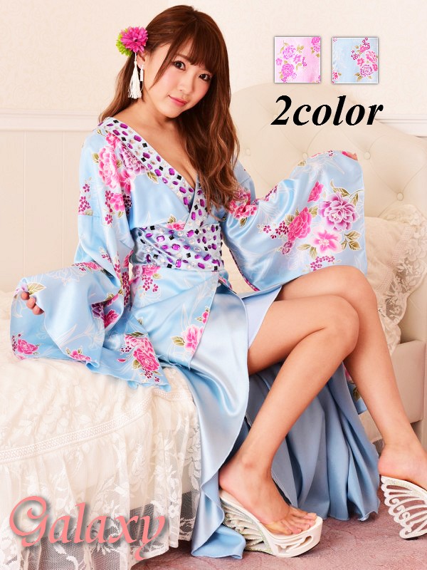 豪華カラービジュ付*淡色花柄花魁ミニinロングサテン着物ドレス