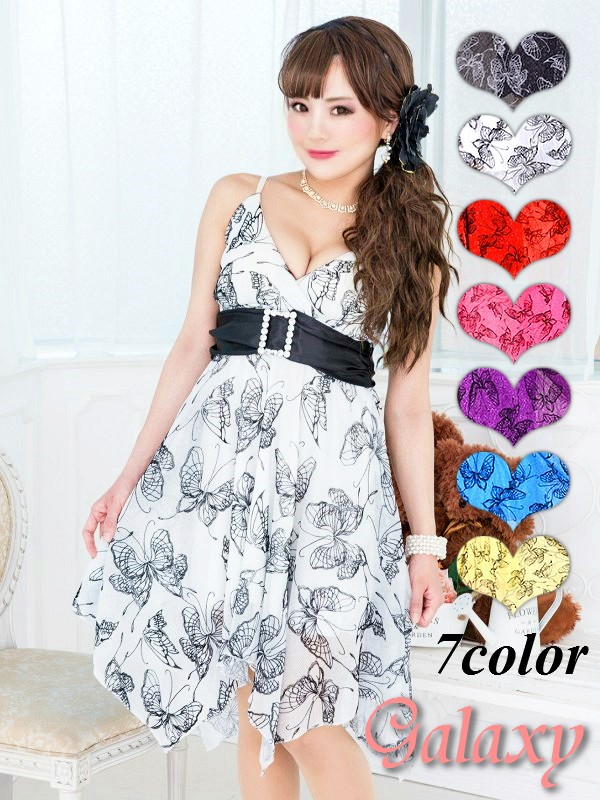フロッキーバタフライ*BIGクリアストーンバックル*ラメネットアシメミニドレス*7color