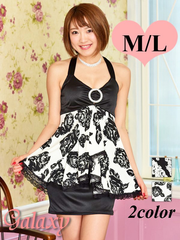 クリスタルストーンサークルバックル付*モノトーンローズ柄テールペプラムワンピース*2color