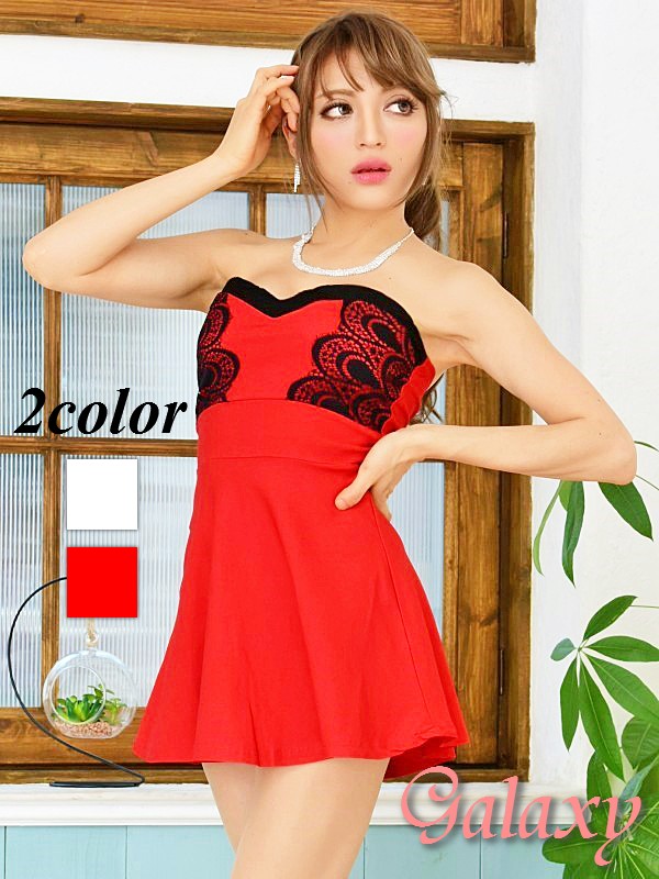 胸元ハートカットベアトップ*レースドッキングミニドレス