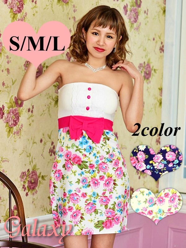 リボン付花柄スリムラインミニワンピース