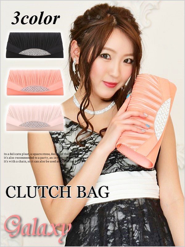 スクエアストーンプリーツフラップサテンクラッチバッグ