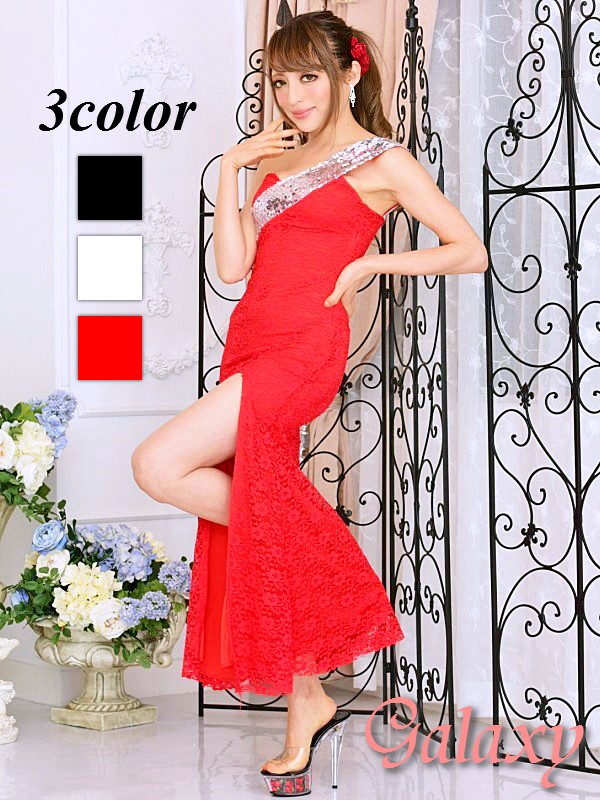 肩紐スパンコール装飾ワンショルダーデザインレースロングドレス