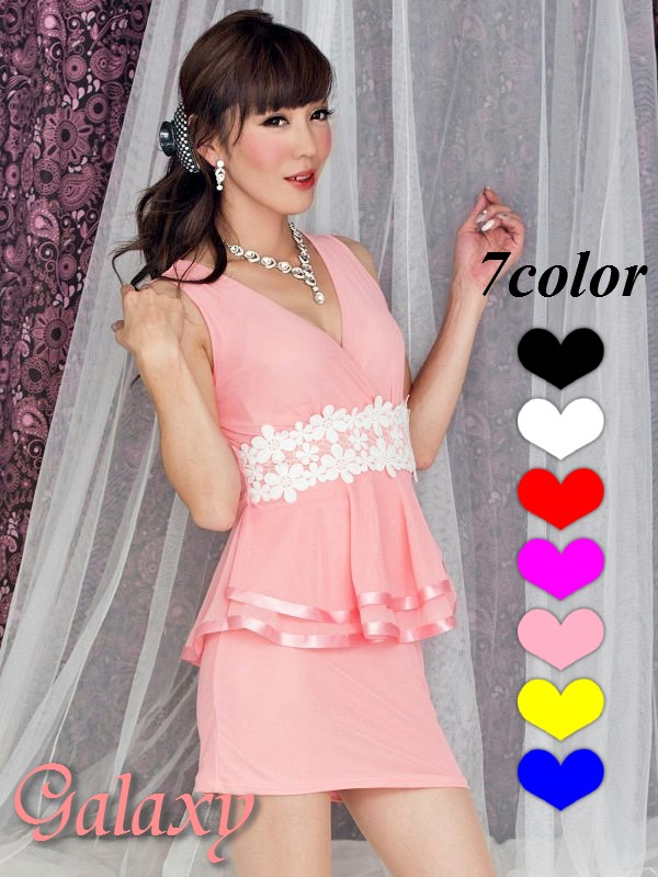 胸下クロシェレースフラワー刺繍*サテン縁取りぺプラム*ストレッチミニワンピ