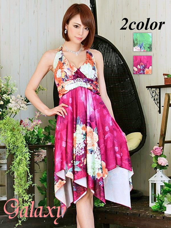クリスタルストーン付サークルバックル*VIVIDフラワー柄ランダムカットミニドレス