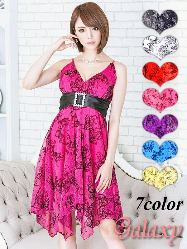 フロッキーバタフライ*BIGクリアストーンバックル*ラメネットアシメミニドレス