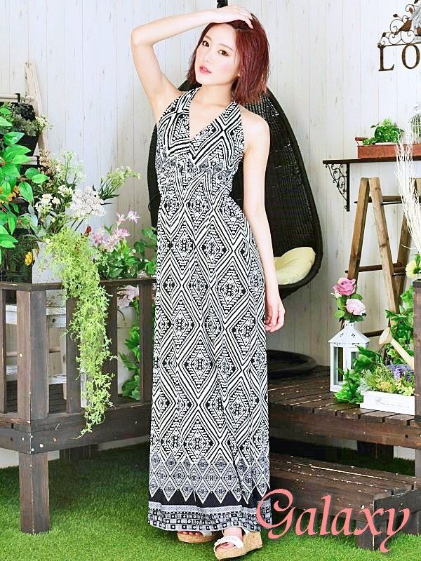 モノクロ幾何学柄*ホルターマキシリゾートワンピース