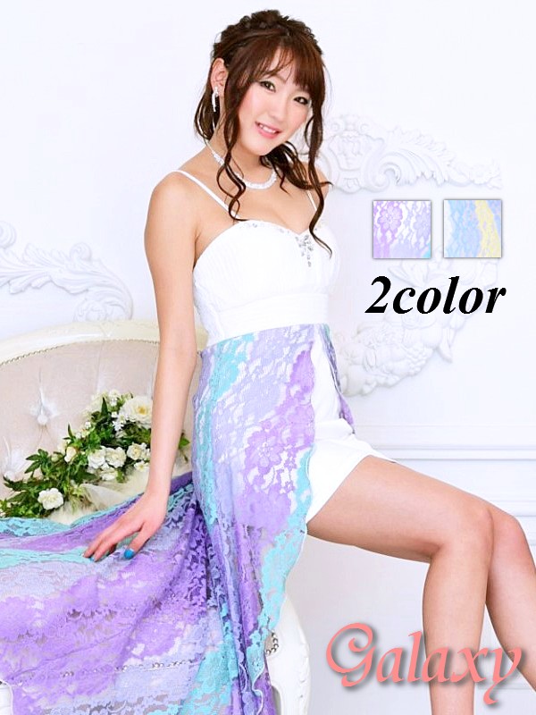 SeaColorグラデーションレース*フラワーモチーフRichビジュー付きサテンミニINロングドレス