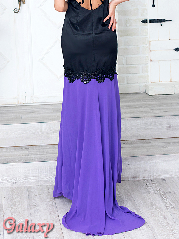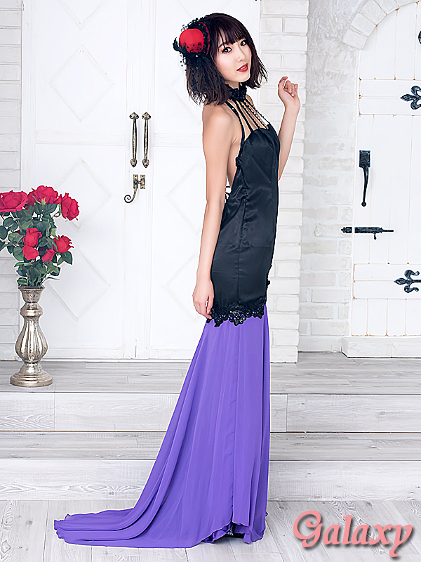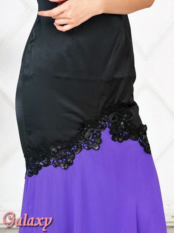 一貫したブラックサテンと、華やかなパープルのシフォン切り替えが見事に調和し、目を引くデザインを生み出しています。