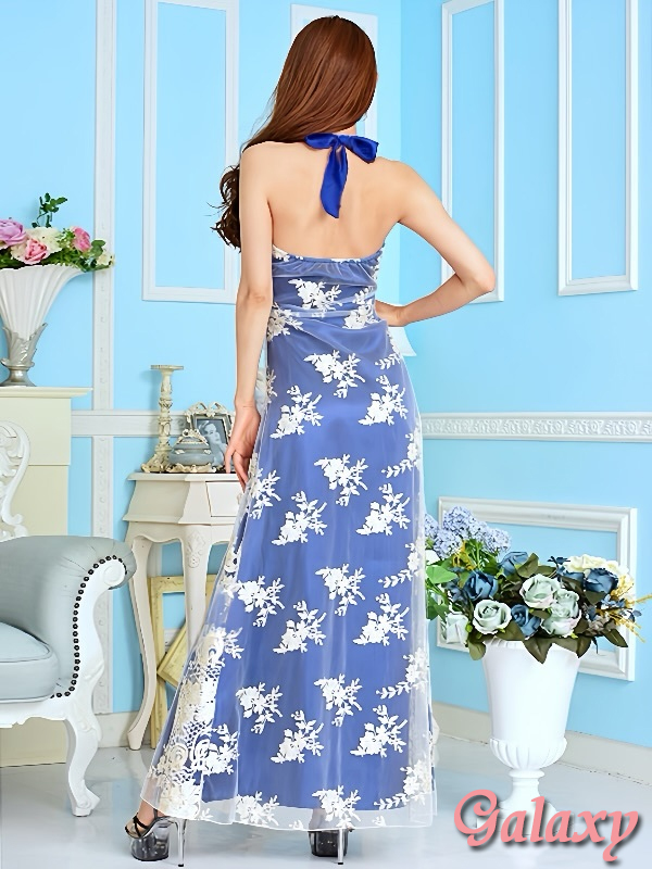 GOLDバックル付フェイクベルト*可憐フラワー刺繍入りチュールレース重ねストレッチサテンロングドレス*2color*M/L [0000-5287]